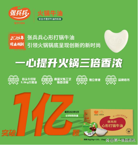 从2018年到2023年,5年时间,这款心形打锅牛油销量突破一亿颗!按照单桌4-5人的客容量,销量破一亿颗,意味着,全球至少4-5亿人品尝到了张兵兵心形打锅牛油带来的三倍香浓体验。