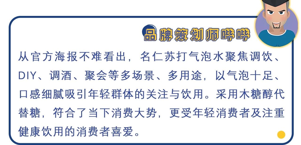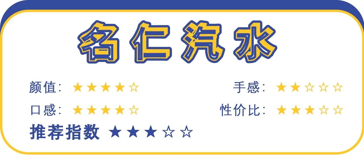 名仁苏打气泡水共有原味、柠檬、桃味、青梅四种口味,外包装清新简洁,主色调分别为蓝色、淡黄、淡粉及淡绿色,其中水果口味包装上则印有相关水果图案,直观清爽。