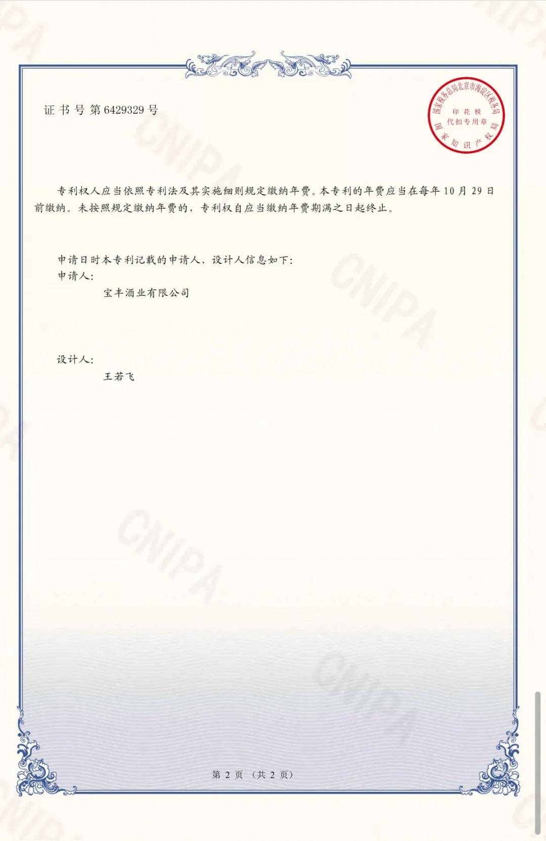 宝丰怼壹瓶的瓶贴和瓶型均已获得国家专利证书,宝丰怼壹瓶酒的生产及销售合规、合法,其设计、包装同样受法律保护。(以下附专利证书文件)