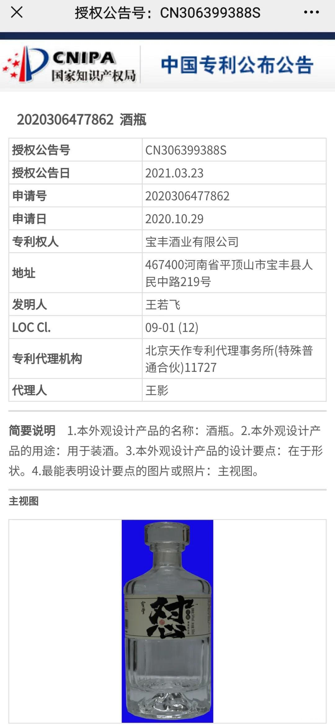 导读:宝丰怼壹瓶的瓶贴和瓶型均已获得国家专利证书。