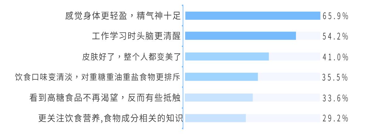 减糖行动还在改变不少用户的饮食口味,帮助他们建立更健康的饮食习惯。在受访的减糖用户中,有35.5%的人表示减糖后饮食口味变得清淡;33.6%被调研者表示不再渴望高糖食品。《报告》还指出,28%的减糖者已完全放弃含糖饮料。