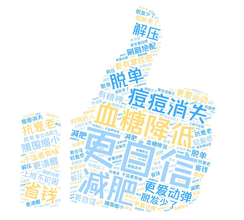 减糖行为正在让这些年轻用户的生活变得更加美好。《报告》显示,人们在有意识地减少糖摄入量以后,生理、心理和行为上都可能发生积极变化。在受访者中,66%的用户表示减糖之后“感觉身体更轻盈,精气神十足”,54%的用户表示“工作学习时头脑更清醒”,41%的用户表示“皮肤好了”。此外,血糖降低、更自信、痘痘消失、脱单也成为了减糖用户的热选关键词。