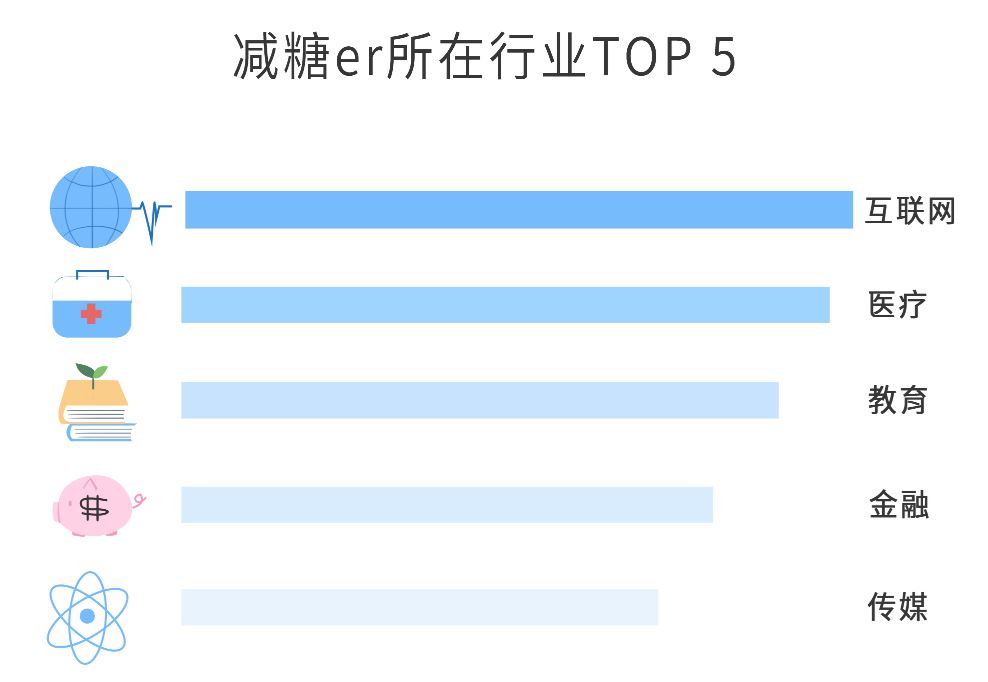 从行业看,减糖用户从事互联网行业的占比最高,其次是医疗、教育、金融、传媒行业。