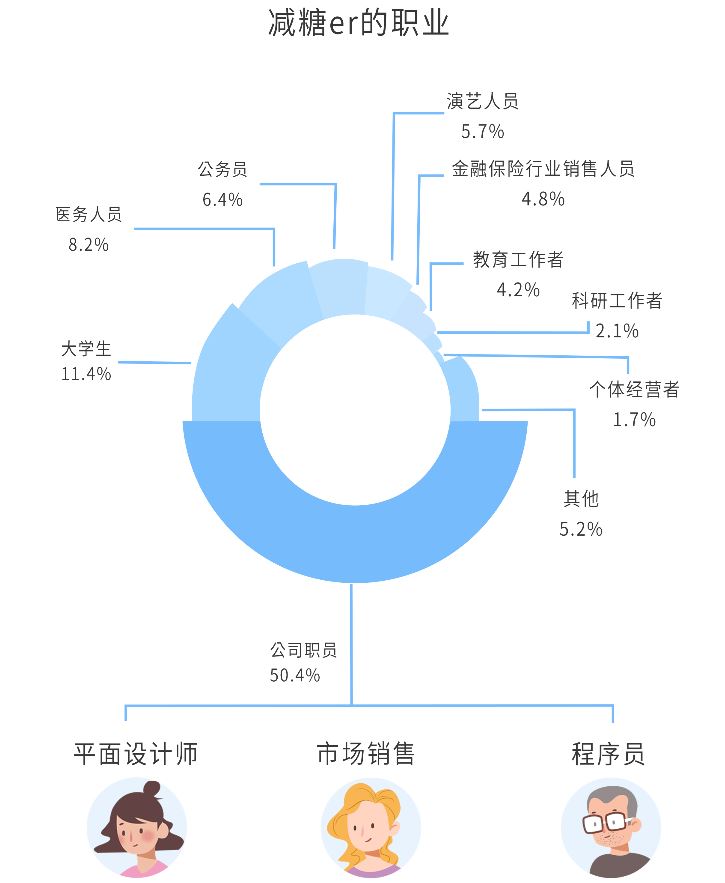 在职业上,以脑力劳动为主的知识工作者是减糖的主要人群。其中,公司职员占到减糖群体的一半以上。大学生、医务人员、公务人员紧随其后。而在公司职员中,设计师、销售和程序员又成为了最“怕糖”的三个具体职业。