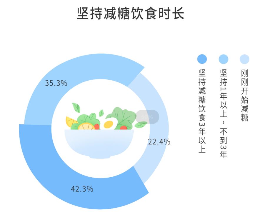 《报告》调查显示,42%的减糖用户表示坚持减糖饮食超过3年,35%的用户表示坚持减糖超过一年,表示刚开始减糖的用户为22%。