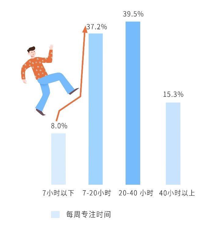 在受访的减糖用户中,超过一半的用户表示长期坚持运动健身,选择“能不动就不动”的用户只有15%。同时,55%的受访者表示每周专注学习20小时以上。