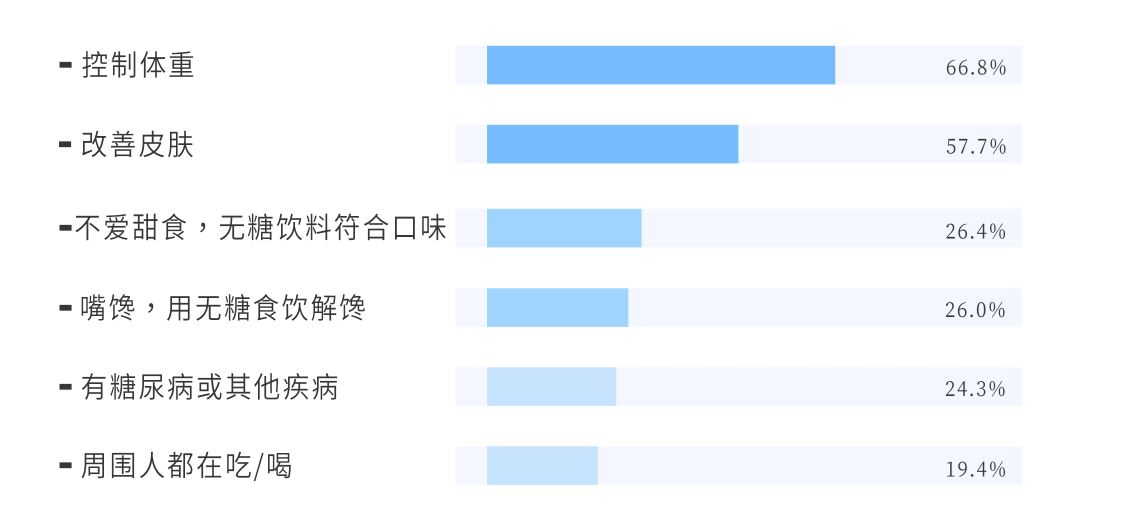 为什么选择减糖饮料或者无糖饮料?调查显示,66.8%的受访者希望控制体重,55.7%的受访者希望改善皮肤,24%的用户表示有糖尿病或相关疾病,只有19%的受访者是追随别人的行为。