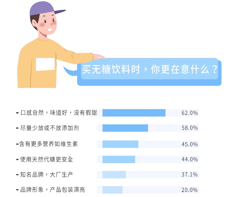 在选择无糖饮料品牌时,大多数受访者都有较清晰的目标。其中,口感自然、添加剂更少、营养物质更多、使用天然代糖更安全、知名品牌、产品包装漂亮,是减糖用户最主要的6个选择标准。