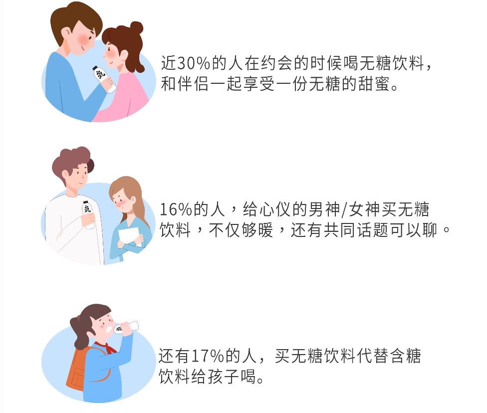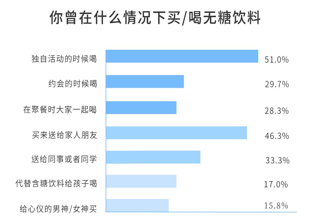 《报告》显示,减糖用户选择无糖饮料的生活场景非常多元化。除了独自饮用外,他们也愿意和他人分享无糖饮料,并借此拉近彼此社交距离。这些场景包括但不限于约会、聚餐、送给家人或朋友等。