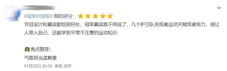 “冠军酒”与“体育冠军”的激情碰撞,也让《冠军对冠军》节目收获不俗口碑,全网热搜不断,成为当前极具代表性的正能量国民综艺。泸州老窖1952也与冠军们一起,传递了中国名酒与中国体育共通的坚持不懈、顽强拼搏、精益求精的精神,以瓶身上的冠军徽章和岁月酝酿的浓香,致敬坚持、致敬超越,为中国荣耀干杯。