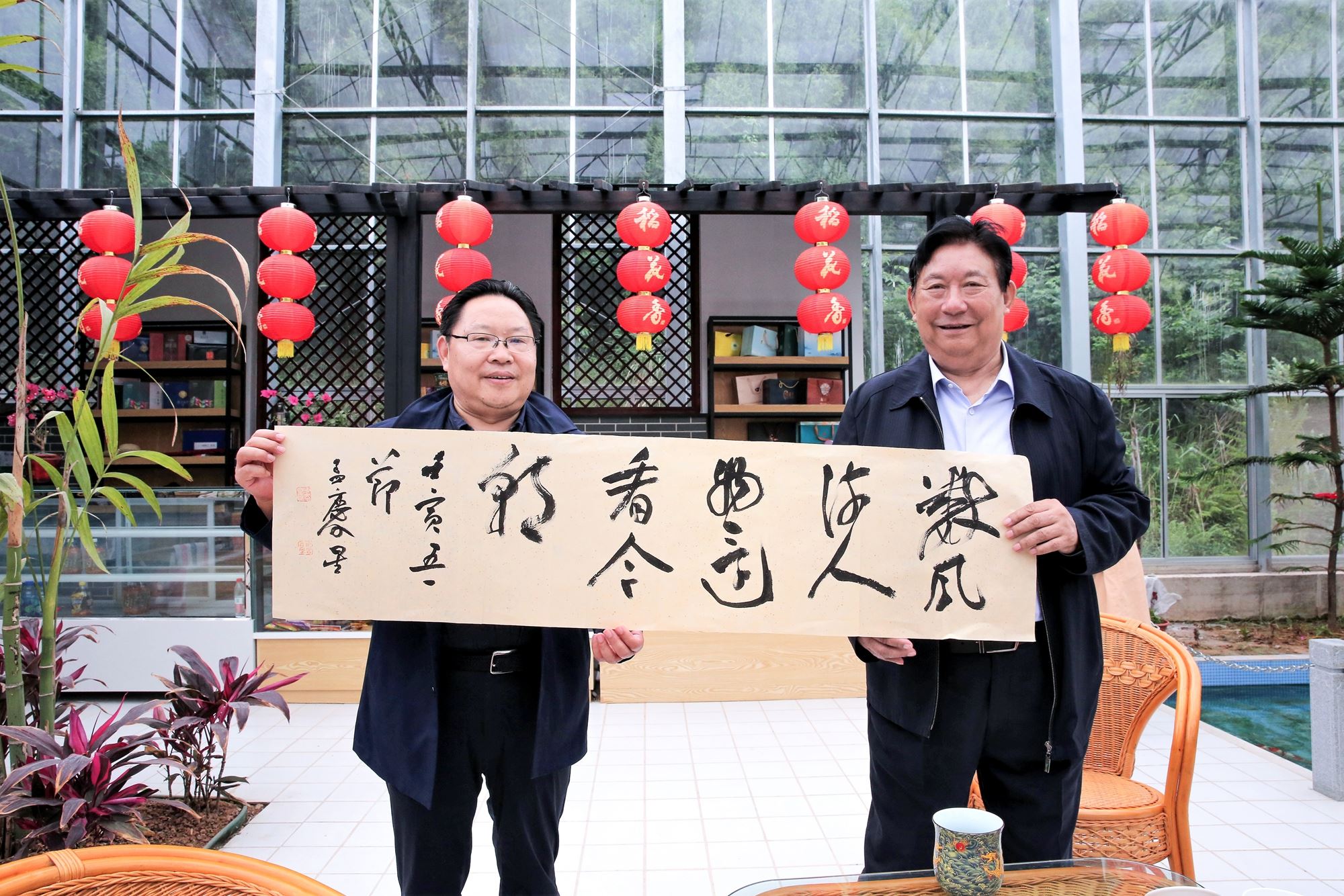 青山如黛,碧水含烟。来到稻花香集团文旅产业项目三峡龙泉湖,秀美的自然风景与文旅体验项目有机融合,宛如清丽隽美的山水画卷。文艺名家们乘车环湖游览,欣赏如画风景,纵情绿水青山间。在龙泉湖热带雨林,马尚云与稻花香集团党委书记、终身名誉董事长蔡宏柱深入交流,畅谈产业经济发展、生态景区建设、文化项目打造等,并带来中国书协理事、湖北省书协主席孟庆星题写的“数风流人物,还看今朝”字画,赠送给秉持初心、实业报国的民营企业家蔡宏柱先生。