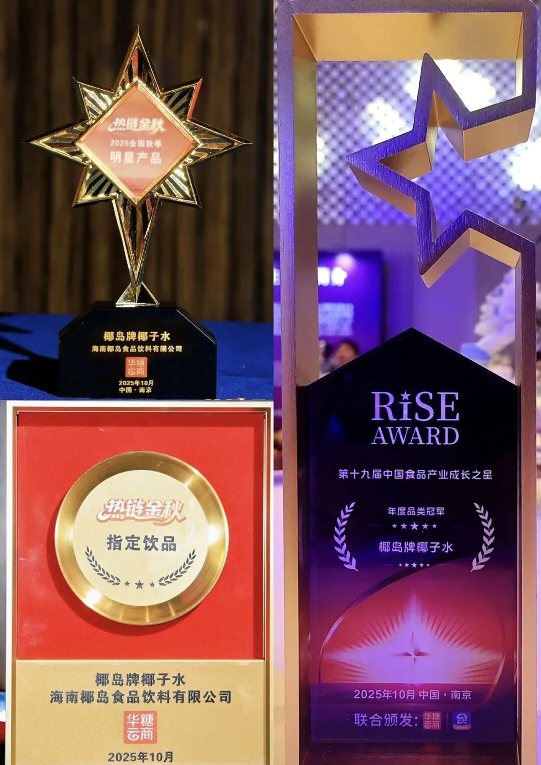 展会期间,椰岛双品类新品凭借实力斩获多项行业大奖,成为全场瞩目的焦点——椰岛鹿龟酒佳品系列以非遗美学与品质底蕴摘得“白酒美学·风尚大奖”,椰岛牌椰子水更一举揽获三项重磅荣誉,双双以硬核实力诠释“老字号新消费”的创新成果。