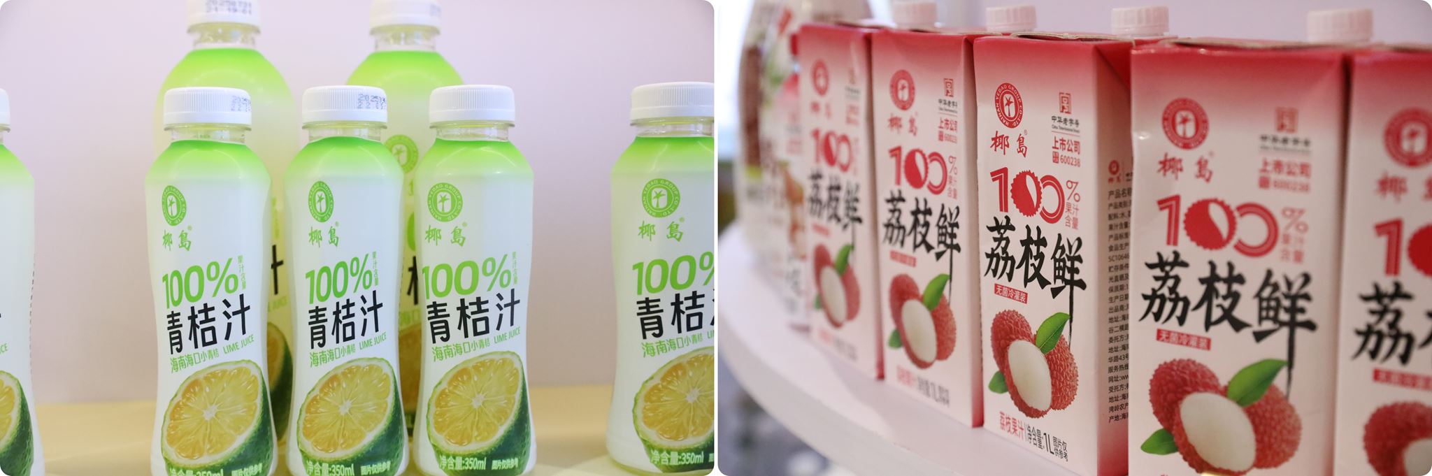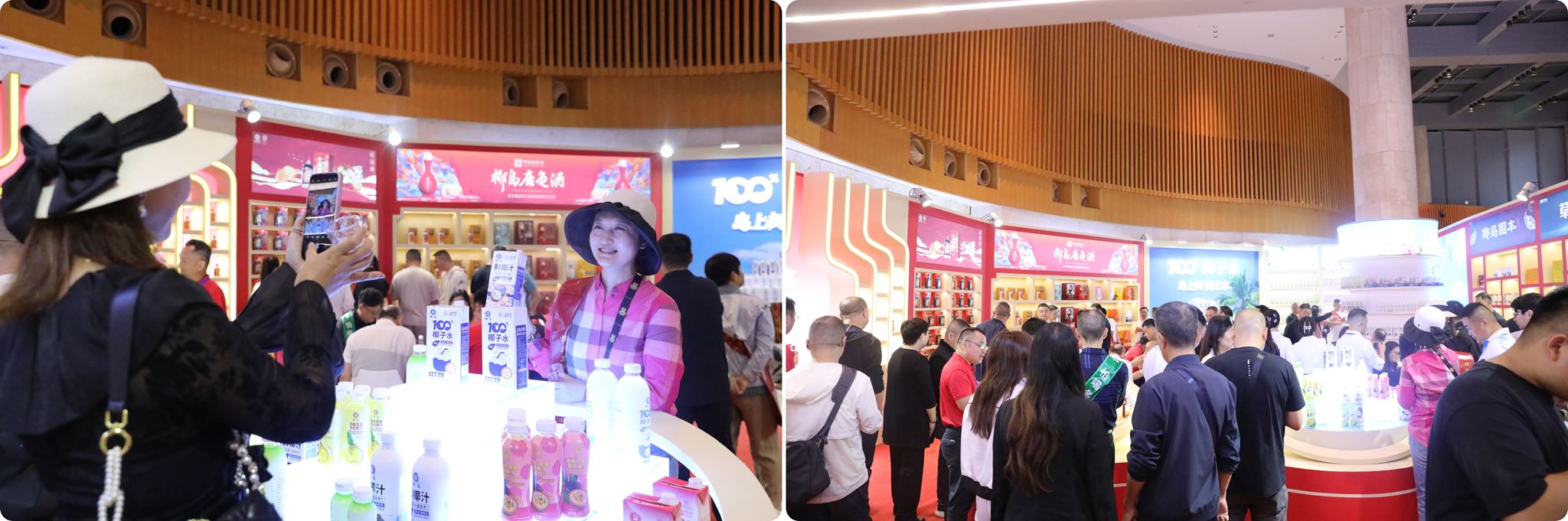 椰子汁、椰子水、青桔汁、荔枝鲜等产品琳琅满目,种类丰富多样的饮料展区则直观呈现“健康+潮流”的产品逻辑。