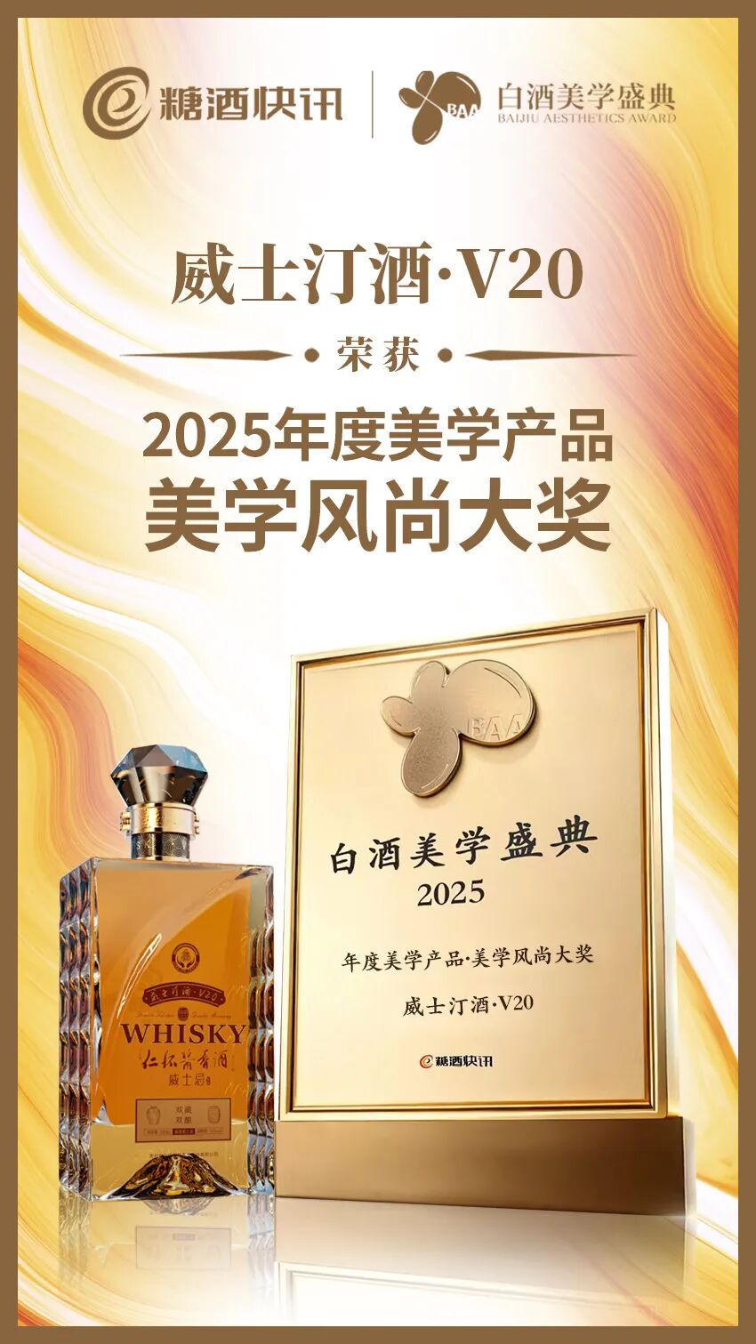 其中,由仁怀酱酒集团匠心酿造的中国首款酱香威士忌产品——威士汀酒·V20,凭借着国际化的审美理念,以及超前品类创新举措引发的酱香威士忌风潮与独特的品饮体验,成功获评“2025年度美学产品·美学风尚大奖”。