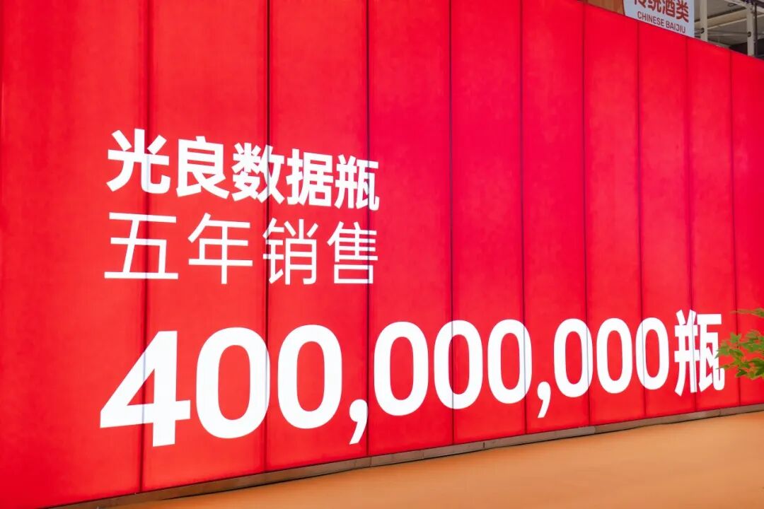 展厅外立面上,白色巨幅字体赫然书写着“5年销售400000000瓶”的战绩。这个数字不仅见证了光良优异的市场表现,更直接体现着其产品力与市场认可度,有力地诉说着一个专注光瓶酒的品牌创造的销售奇迹。