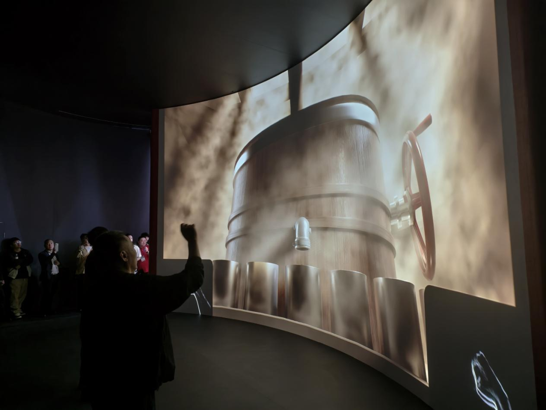 当观众步入展馆内“一桌好饭”的筹备空间,巨大的环形屏幕上的画面与节奏明快的音乐搭配,带动大家用身体动作融入体验。观众化身为“主厨”,跟随指令进行节拍式的切菜、揉面、炒菜等操作。尤为精妙的是,在整个烹饪过程中,光良巧妙地融入了其酿酒的关键环节,如加调味料对应上甑撒粮、炖煮对应糖化发酵。当一桌佳肴准备就绪,一瓶光良酒也恰好“酿成”登场,完美诠释了“好饭配好酒”的天然关联。
