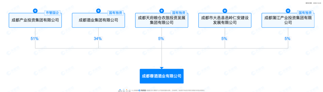 成都蓉酒成立于11月21日,其股东阵容凸显了强烈的“成都国资”色彩。控股股东成都产业投资集团是成都市属大型国有资本投资运营平台,其余股东如成都酒业集团、天府粮仓农旅投、成都蒲江产业投资集团等,也均为成都区县级国资企业。这一结构表明,成都蓉酒是承载着区域产业整合使命的国有资本运作平台。