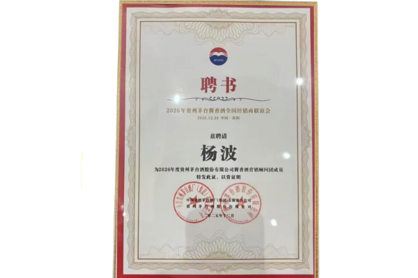 次日(12月29日),2026年茅台酱香酒全国经销商联谊会如期召开,会议以“坚持以消费者为中心,夯实渠道韧性,同心聚力赢未来”为主题,复盘过往市场工作,规划2026年及未来茅台酱香系列酒发展蓝图,凝聚行业合力。同时对年度优秀经销单位予以表彰。会上,华鼎酒业因2025年度在茅台1935推广、市场建设及客户维护方面表现突出,荣获“2025年度茅台酱香酒特别贡献奖(茅台1935)”;公司董事长杨波再度受聘为“2026年度贵州茅台酒股份有限公司酱香酒营销顾问团成员”。这份认可既源于其个人深厚行业积淀与敏锐市场洞察,也彰显茅台对华鼎综合实力的信任。