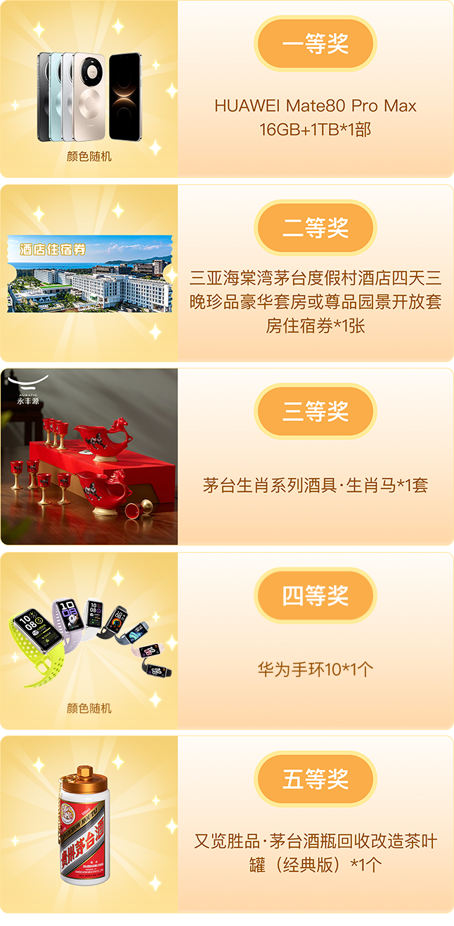 详细规则请前往i茅台APP“鼓传雅韵 马踏新程”活动页查看,以活动页为准。与此同时,贵州茅台酒(乙巳蛇年)、贵州茅台酒(笙乐飞天)两款产品,将于1月1日下架i茅台APP。