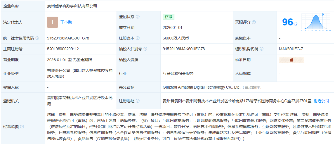 据天眼查显示,近日,贵州茅台成立全资子公司“贵州爱茅台数字科技有限公司”,注册资本6亿元。贵州爱茅台数字科技公司由茅台全资控股,法定代表人王小鹏(茅台集团数字与信息管理部主任),总经理王华林(原茅台销售公司副总经理),业务聚焦i茅台平台运营及数字化营销。注册地位于贵阳高新区,经营范围涵盖互联网服务、软件开发、数据服务等。