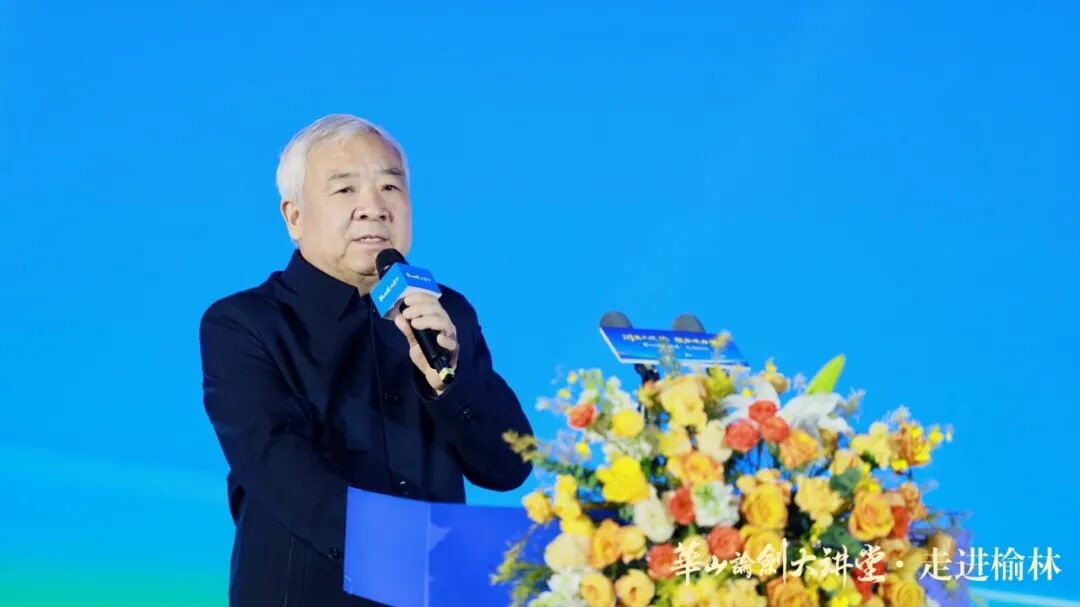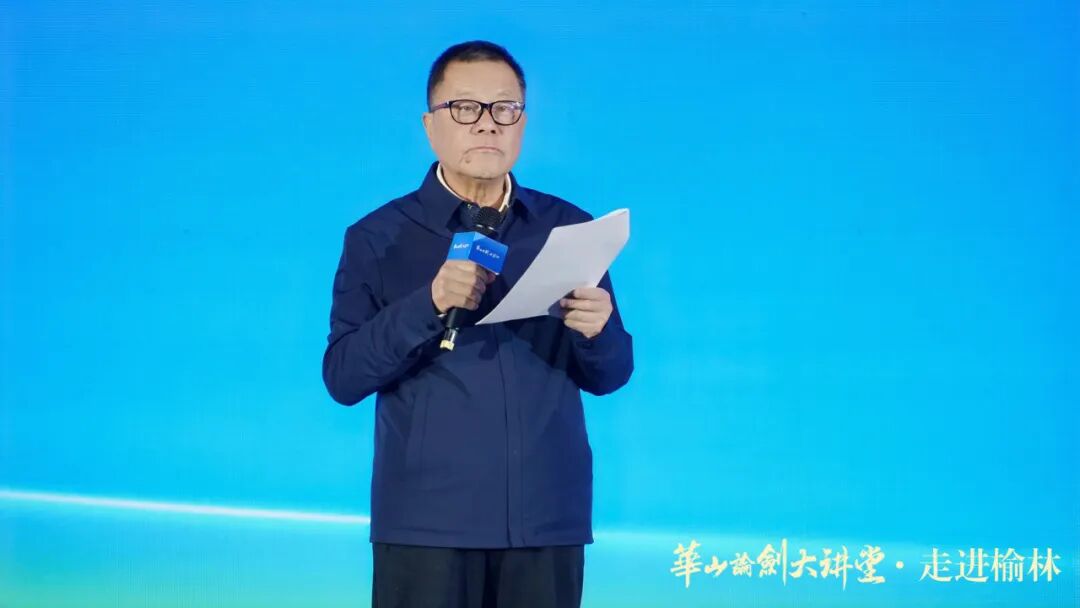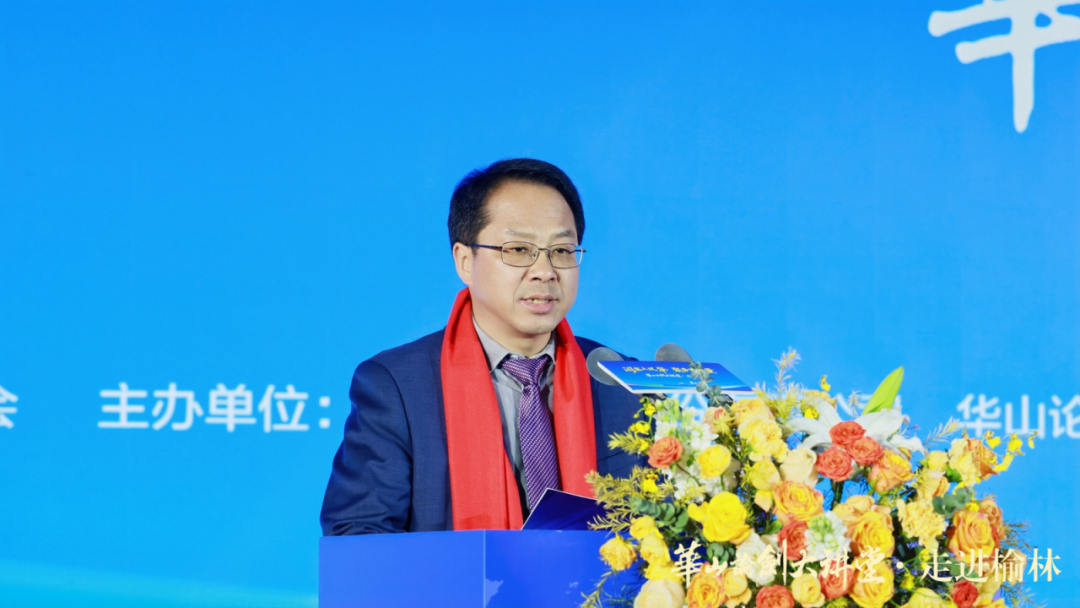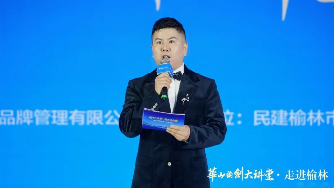 全国政协委员、民建陕西省副主委乔伟讲话,他表示,榆林是中华文明多元一体格局的生动缩影,兼具长城的雄浑风骨,黄河的磅礴气魄,能源时代的澎湃力量。榆林人民“不畏艰难、开拓创新”的榆林精神与华山论剑品牌“勇智敏仁”文化内涵同频共振。此次“华山论剑大讲堂·走进榆林”是推动文化传承创新的生动实践,为陕北文化与品牌文化的融合发展搭建了桥梁。他还充分肯定华山论剑品牌作为民建优秀会员企业,长期践行社会责任、投身公益事业的担当精神,并强调文化是民营经济高质量发展的重要支撑。最后,他呼吁各界携手以文化赋能商业、以精神引领发展,为民营经济蓬勃发展、为中国式现代化陕西新篇章贡献智慧与力量。