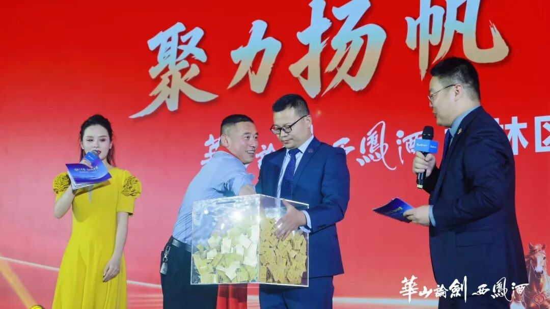 过去一年,华山论剑西凤酒深耕榆林市场,在品牌与各终端合作盟友的通力协作下,区域市场业绩逆势突围,圆满超额完成全年任务,成功跻身华山论剑西凤酒亿元市场,彰显出强劲战略定力与发展韧性。为表彰先进、树立典范,进一步凝聚厂商协同发展合力,大会特设“宴席拓展奖”“突出贡献奖”,对60家优秀合作盟友予以表彰奖励。华山论剑品牌管理有限公司党委书记、总经理张周平宣读奖励决定。
