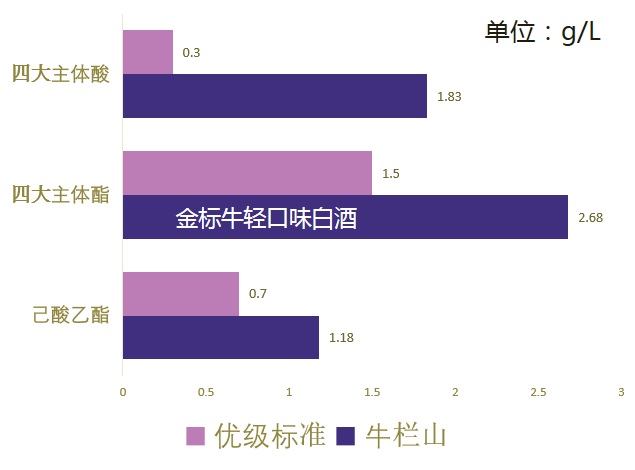 尤其是通过优化发酵工艺、改善蒸馏技术、纳米级过滤等手段,牛栏山降低金标牛轻口味白酒的杂醇油含量,减少了饮用时的刺激性与粗糙感,使得酒体更加纯净、柔和。同时,酒体中检出的16种口味物质相关组分,也形成了轻口味品类的特有分子结构,如对调节酸碱平衡有积极作用的甲基硫酸与甲基磺酸钠,以及赋予柔顺口感的不挥发有机酸,奠定了其丰富、顺滑的味觉体验。