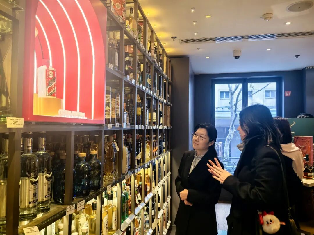 代表团还考察了巴黎老佛爷商场的酒窖专区,重点关注其品类规划、渠道建设及产品展陈,为优化茅台在欧洲终端体验提供参考。