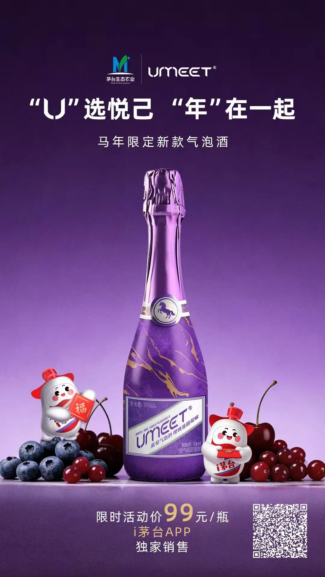 UMEET蓝莓气泡酒(樱桃蔓越莓味)的推出,标志着茅台生态农业公司深化产品战略布局、精准响应消费升级趋势的关键落子。该产品不仅进一步夯实了UMEET品牌与年轻客群的情感纽带,更通过风味创新与场景适配,完善了UMEET蓝莓气泡酒品类的差异化战略矩阵。在春节黄金消费周期,产品登陆i茅台平台并深度融入“‘U’选悦己 ‘年’在一起”主题营销活动,同步推出单支轻享装与双支臻选礼盒装,以精细化产品设计覆盖个人悦己消费与高端赠礼场景,持续释放品牌年轻化势能。