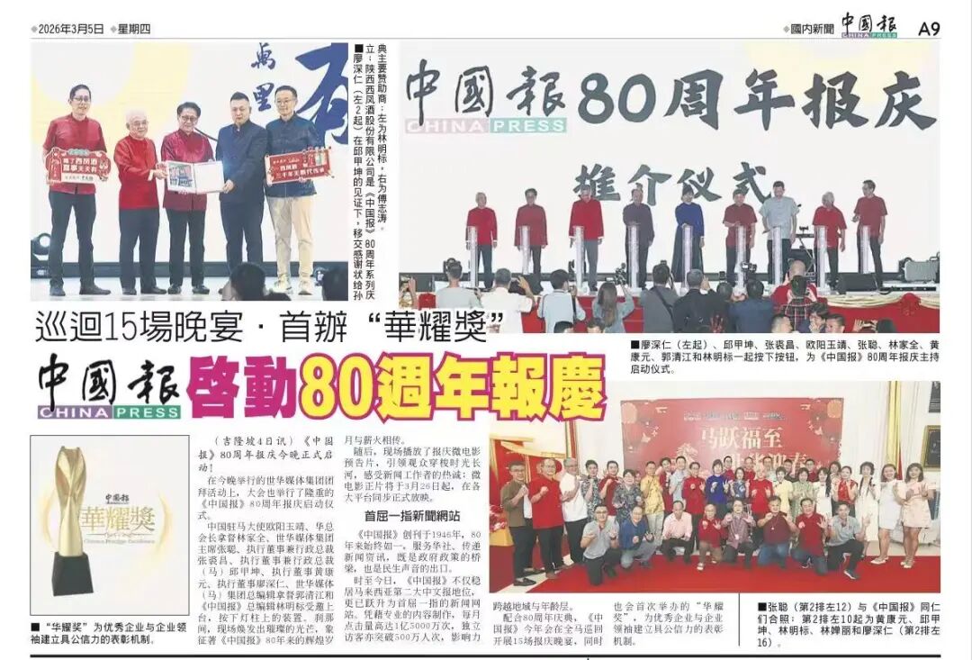 3月4日,马来西亚世华媒体新春联欢会暨《中国报》80周年报庆推荐会在马来西亚吉隆坡盛大启幕。中国驻马特命全权大使欧阳玉靖、华总总会长拿督林家全、中总总会长拿督吴逸平、世华媒体集团董事主席张聪、世华媒体集团执行董事兼《中国报》总执行行长廖深仁、永成食品饮品(马来西亚)有限公司董事长傅志涛、营销管理有限公司国际事业部副总经理孙立、马来西亚各界华人精英、媒体同仁及商界领袖共1200余人齐聚一堂,共贺新春佳节,同庆《中国报》八十载风华。