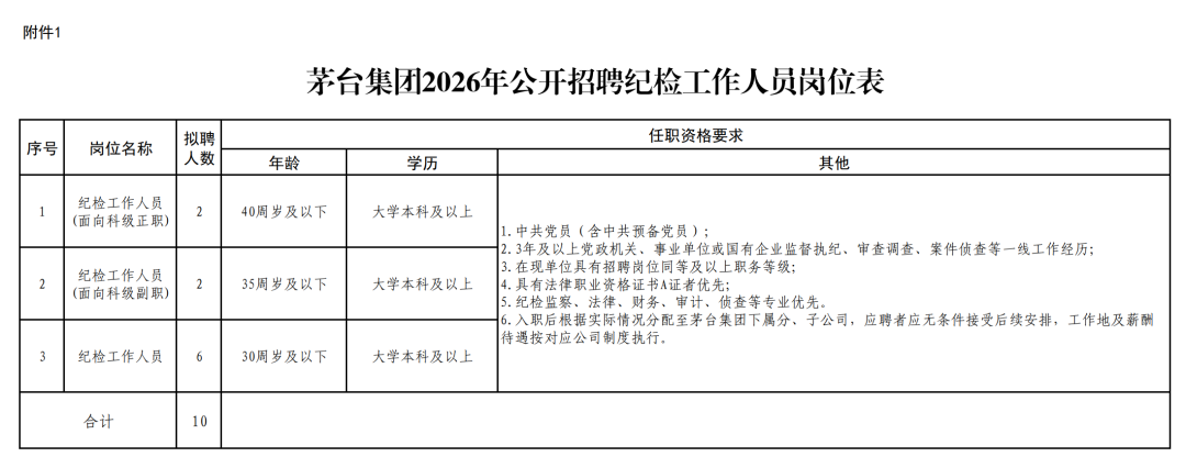 茅台集团拟招聘10名纪检工作人员