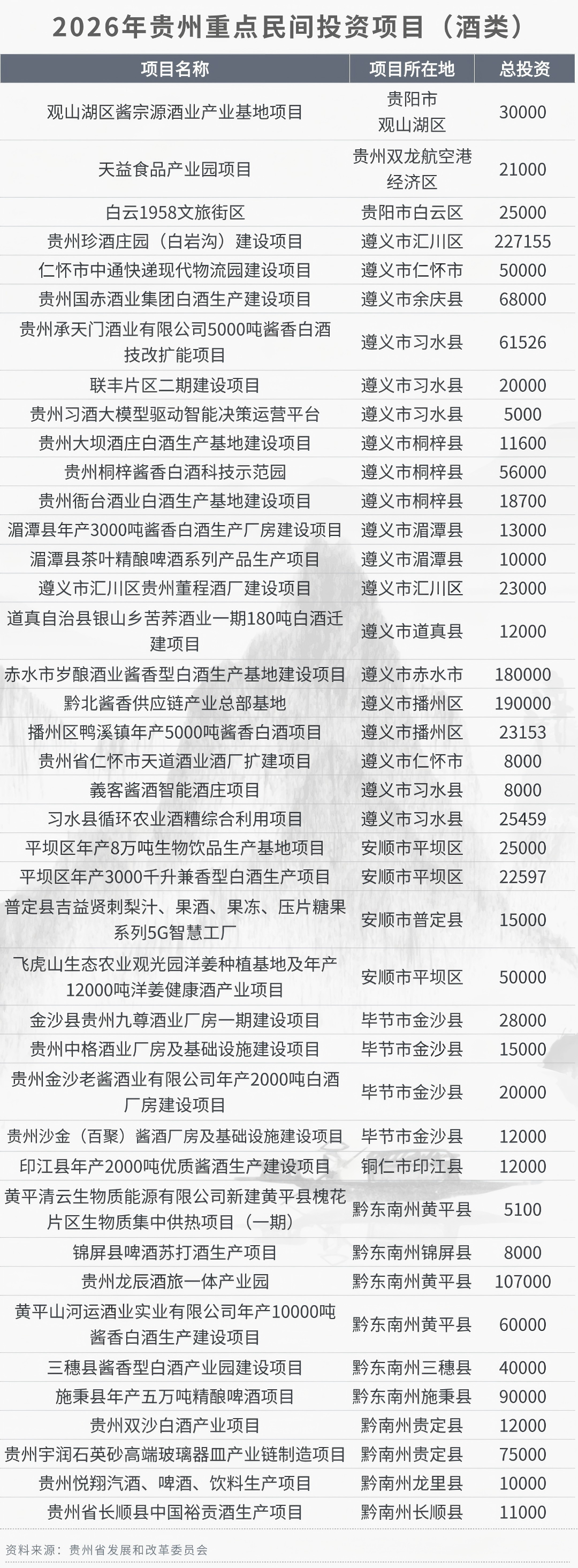 近日,贵州省发展和改革委员会发布2026年重点民间投资项目清单。本次共纳入项目1500个,总投资9654.02亿元。其中,酒类相关项目 41个,总投资170.43亿元,详见下图。(贵州省发展和改革委员会)