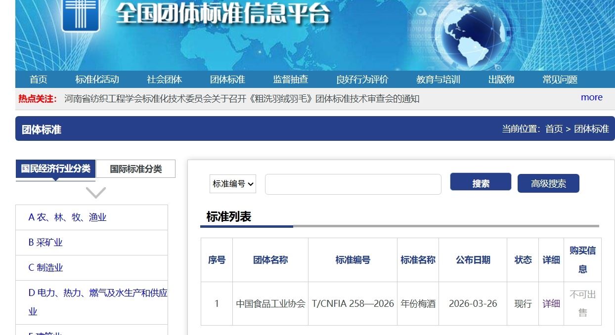 《年份梅酒》定义了年份梅酒必须是以中国青梅为原料,高粱酒为基酒,添加黄冰糖,于陶坛混合浸泡六个月及以上捞果,封坛,陈酿,历年三年及以上,经调配等工序加工制成的青梅酒.....这项团标作为价值与等级标准,为品类的品质升华和价值攀升建立了标尺。
