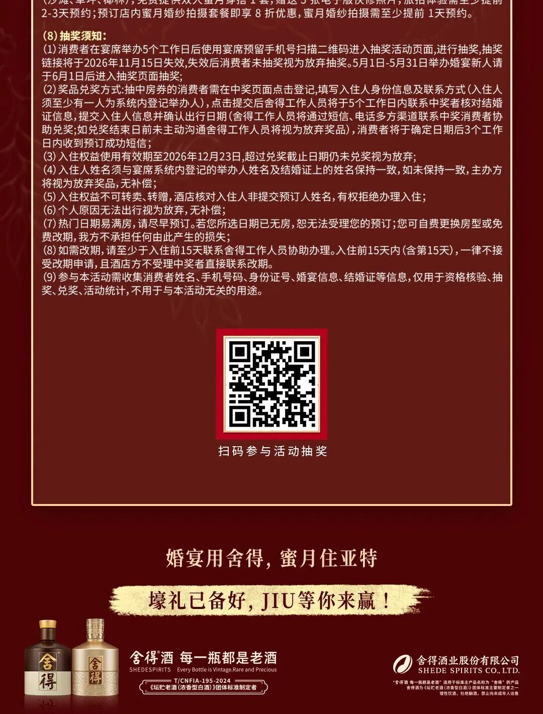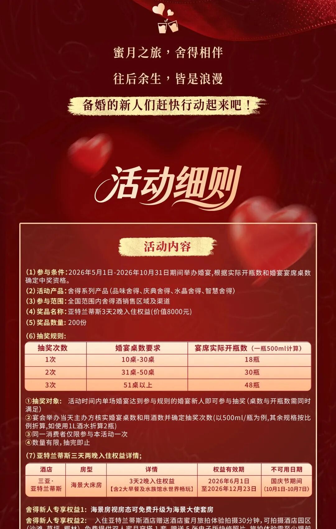 4月25日,舍得酒官宣舍得婚礼季重磅上线。活动时间为2026年5月1日至2026年10月31日,活动期间的婚宴新人使用活动舍得酒,即智慧舍得、品味舍得、庆典舍得、水晶舍得作为婚宴用酒,即有机会赢取舍得蜜月壕礼,获得亚特兰蒂斯三天两晚入住权益(含2大早餐及水族馆水世界畅玩)。(舍得酒)