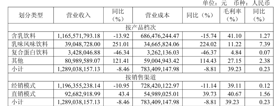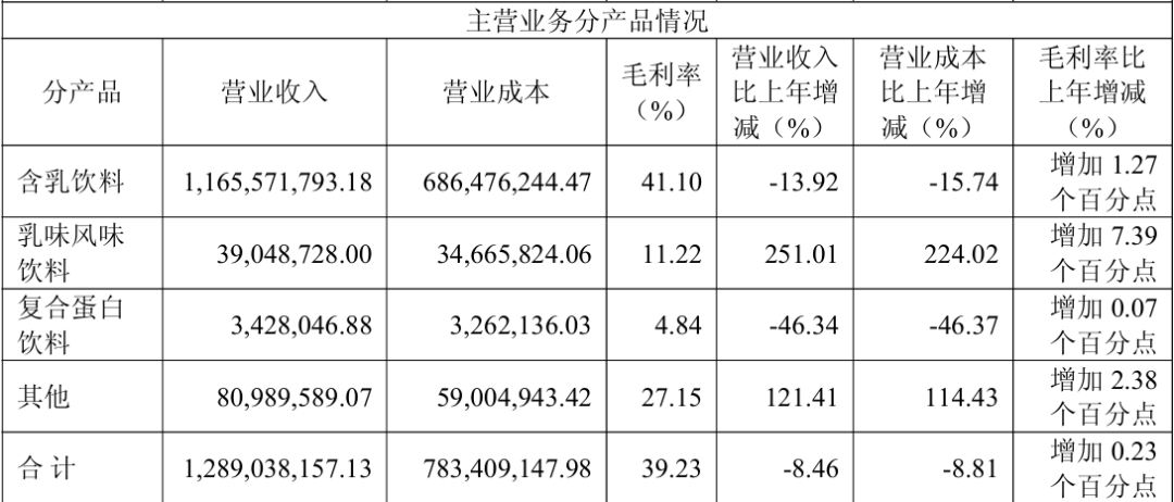 报告期内,公司实现营业收入12.96亿元,同比下降8.44%;归属于上市公司股东的净利润1.96亿元,同比下降12.29%。这份成绩单清晰地反映出,这家以“甜牛奶”著称的老牌乳饮企业,正深陷核心产品老化与消费趋势背离的增长泥潭。
