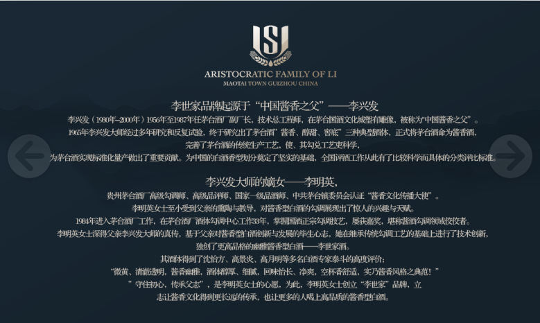 ”守住初心,传承父志”,是李明英女士的心愿,为此,李明英女士创立“李世家”品牌,立志让酱香文化得到更长远的传承,也让更多的人喝上高品质的酱香型白酒。