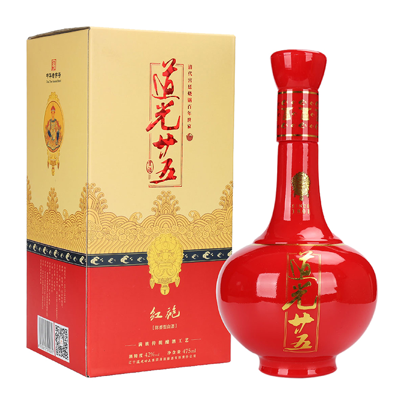采用传统中国红,配以祥云和龙纹,营造皇家风范。仔细品味,陈香典雅,绵柔醇厚,具有独特的满族酒陈香风格。